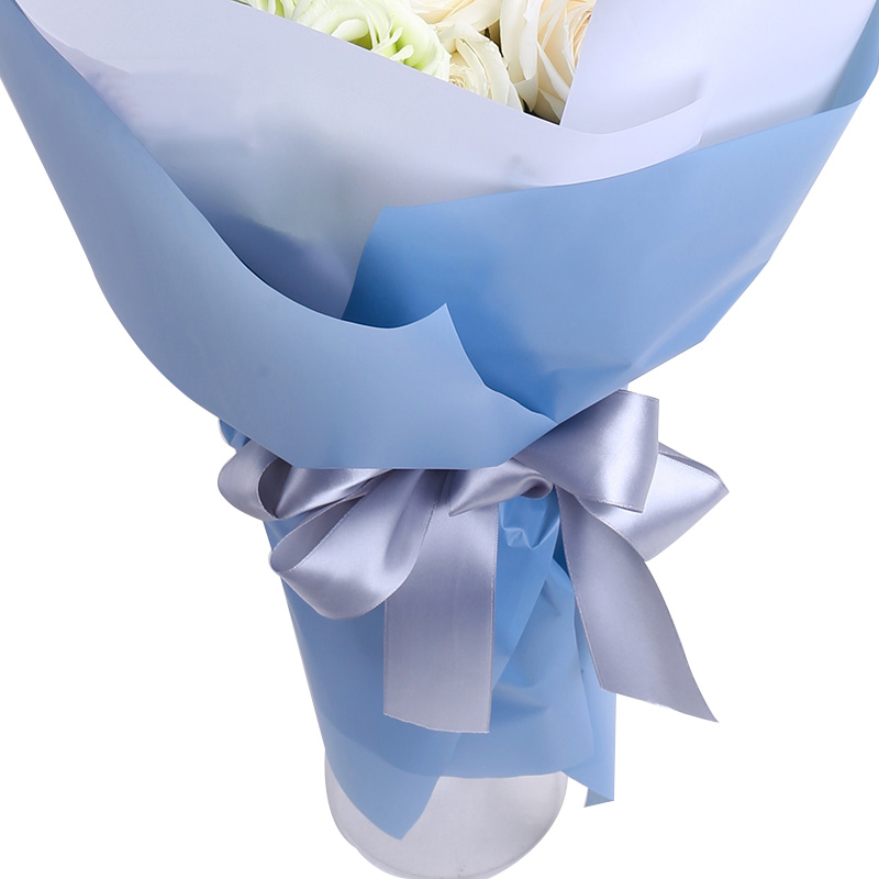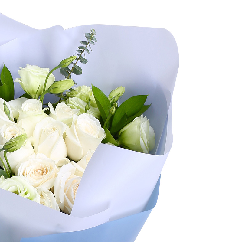 9枝白玫瑰,搭配4枝白色洋桔梗、绿叶、尤加利叶包装: