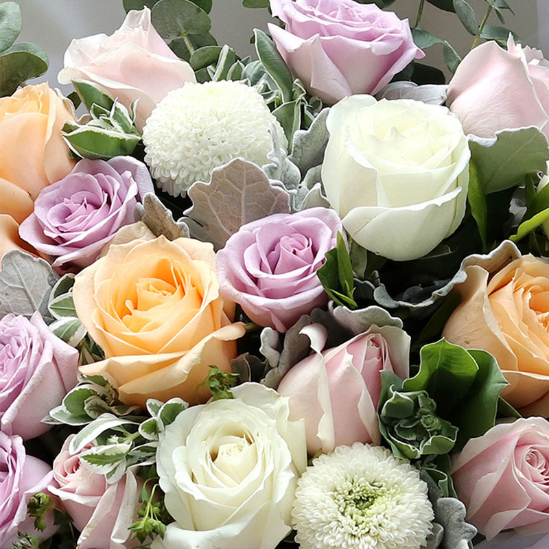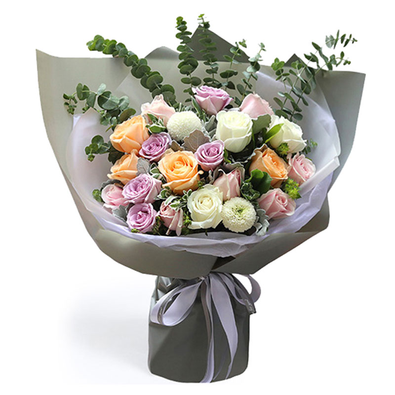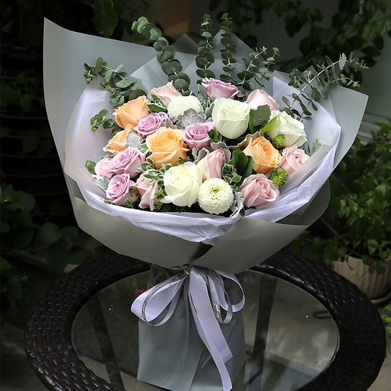 5枝紫色玫瑰,4枝香槟,7枝粉玫瑰,3枝白玫瑰,2枝白色乒乓菊,叶上花,尤加利叶搭配包装: